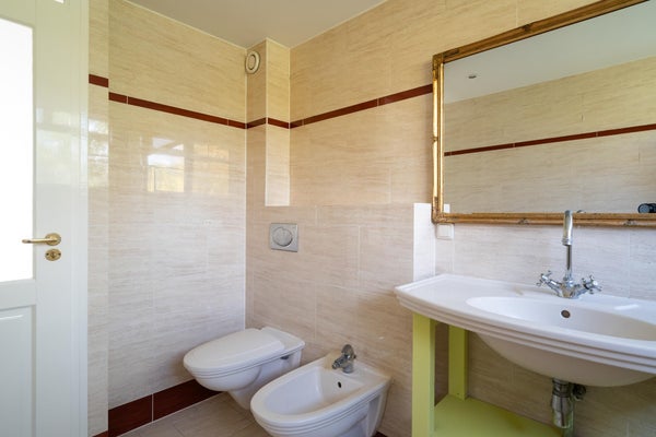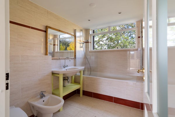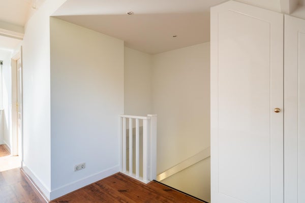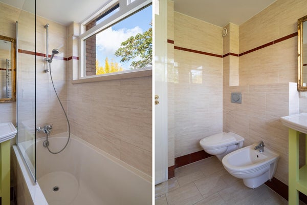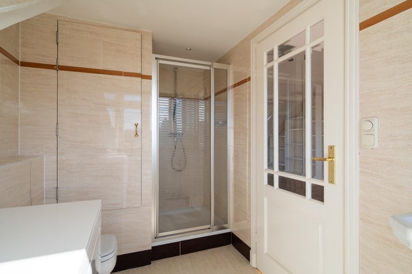 Overloop, voorslaapkamer, achterslaapkamer, beide met vaste kastenwand, achterslaapkamer met balkon, nette badkamer met bad, toilet, bidet en wastafel.
