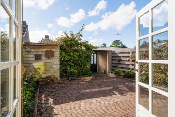 Entree achterom, gang met garderobe, toilet en trapkast, lichte woonkamer met toegang naar de achtertuin met schuur en achterom, moderne keuken met inbouwapparatuur en toegang naar de achtertuin.