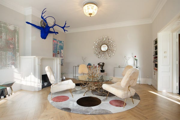 De ontvangstkamer, tekenen kamer, en eetkamer hebben allemaal hoge plafonds, eiken houten vloeren, indrukwekkende open haarden en authentieke Franse ramen, wat een warme en uitnodigende sfeer creëert. Het deels overdekte terras is toegankelijk via zowel de hal als de tekenen kamer.