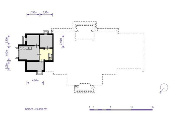 De kelder, ongeveer 50 m² in totaal, bevat twee aparte opslagruimtes en een ketelruimte met het centrale verwarmingssysteem.