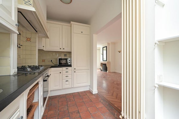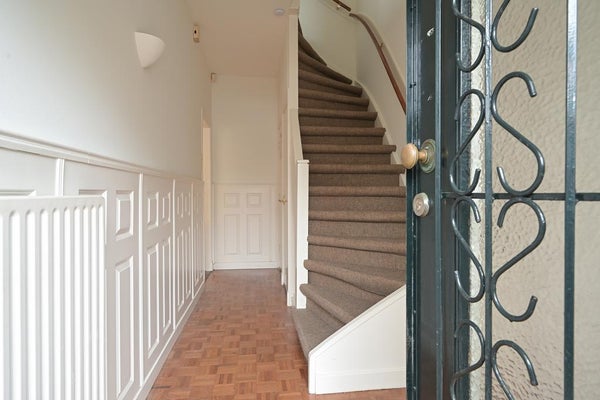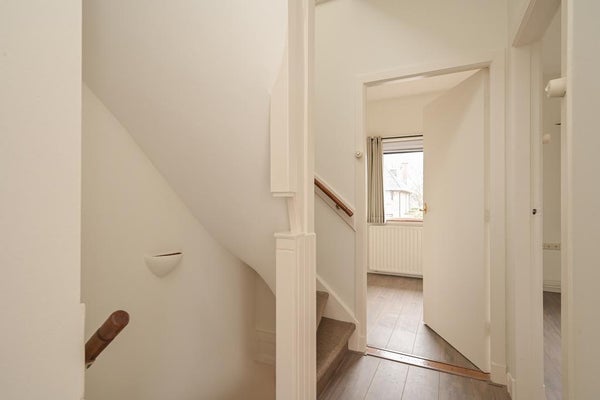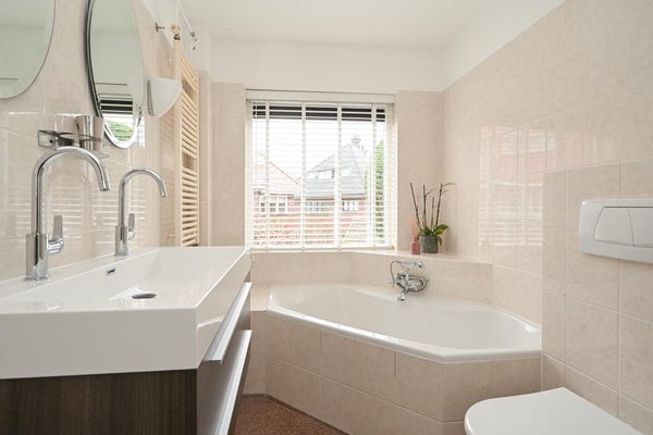 Overloop met toegang tot twee ruime slaapkamers, waarvan één is voorzien van ingebouwde kasten, en een derde, kleinere kamer die uitstekend kan dienen als kinder-, logeer- of studeerkamer. De complete badkamer beschikt over een ligbad, aparte douche, wastafel en wc.