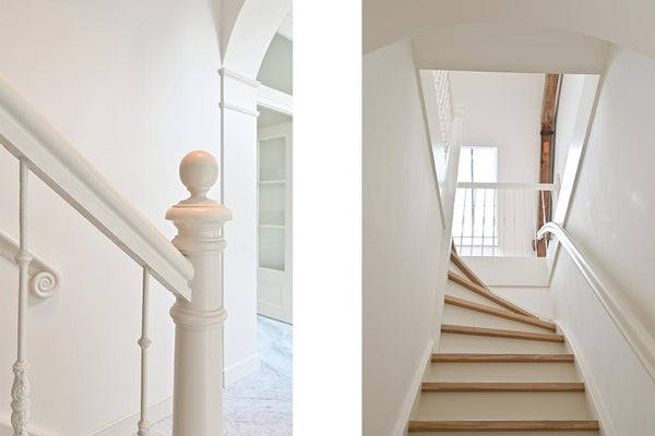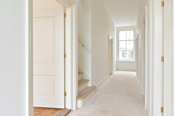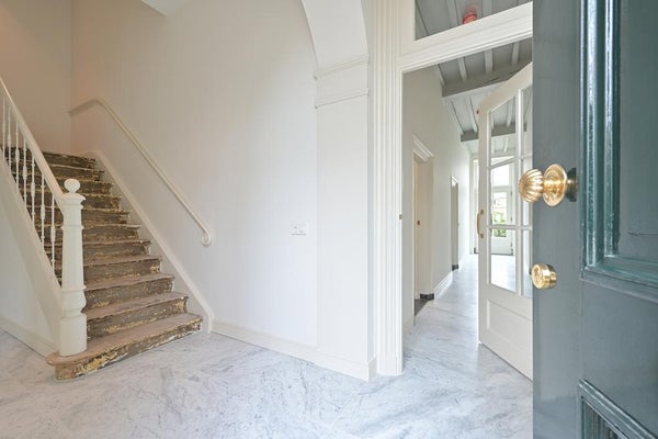 Grote entree met hal, garderobe en toilet. De ruime keuken, eetkamer en woonkamer zijn elegant met elkaar verbonden door originele ensuite-deuren. De woonkamer opent direct naar de zonnige achtertuin. Op deze verdieping is ook genoeg opbergruimte.