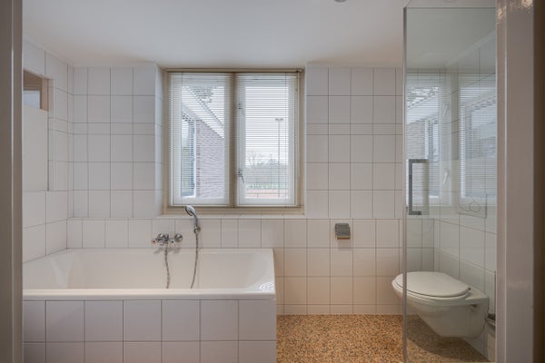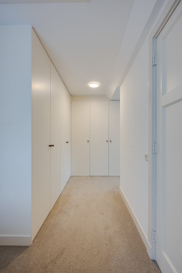 Op de eerste verdieping bestaat het huis uit twee comfortabele slaapkamers en een stijlvolle badkamer met een ligbad, douche en toilet. De overloop is voorzien van uitgebreide inbouwkasten, wat uitzonderlijke opbergruimte biedt. Een zolder biedt extra opslagruimte, aangevuld met een praktische kelderkast.