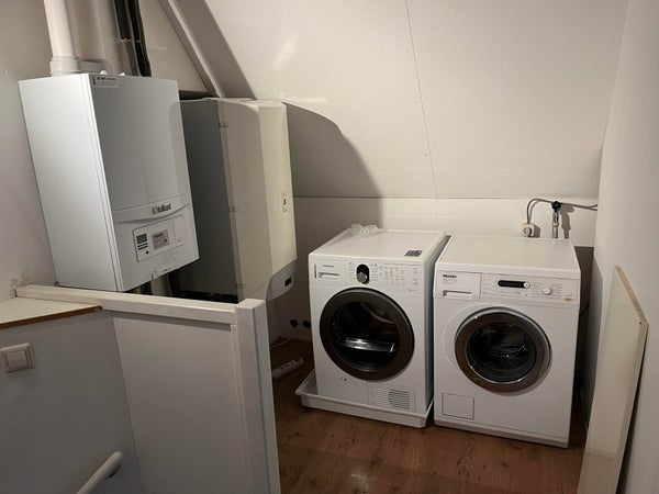 2e verdieping: via een vaste trap kom je op de overloop van de 2e verdieping. Hier bevindt zich een ruime slaapkamer met veel bergruimte. Op de overloop staat de wasmachine en droger en de opstelplaats voor de cv ketel en mechanische ventilatie.