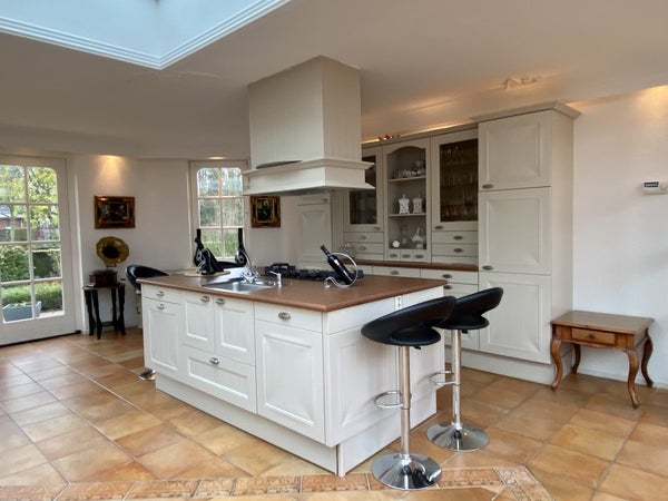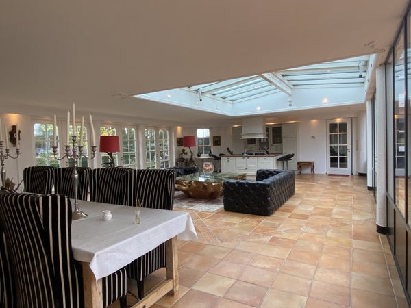 Na de ruime hal komt u binnen in een zeer ruime serre welke voorzien is van veel ramen, plavuizen op de vloer, eigen keuken voorzien van inbouwapparatuur én toegang tot een heerlijke ruime patio.