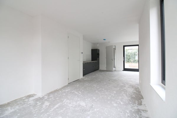 Royale woonkamer in L-vorm, beschikkende over een open keuken, vloerverwarming en veel natuurlijke lichtinval vanuit de ramen aan drie zijdes. Middels een brede schuifdeur kunt u de achterliggende tuin bereiken.