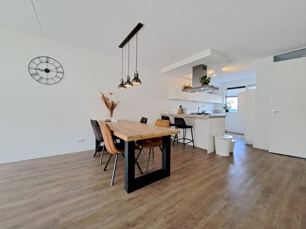 De lichte woonkamer met openslaande deuren naar de tuin is tuingericht en biedt voldoende ruimte voor de zithoek en eettafel. De open keuken aan de voorzijde is modern en compleet ingericht, voorzien van een gaskookplaat, combi oven, afzuigkap, koelkast, vriezer en vaatwasser.
