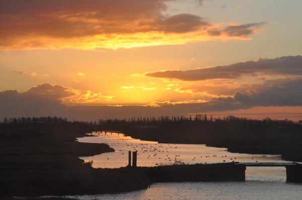Een groot raam biedt een prachtig uitzicht over de weilanden vanuit bed.