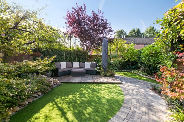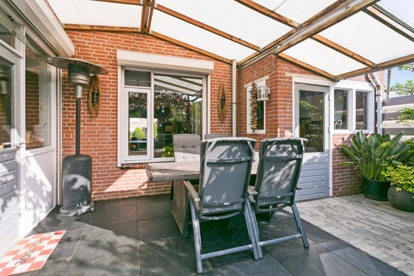 De achtertuin is verzorgd en groenrijk ingericht met meerdere terrassen om zo op ieder moment van de dag te genieten van de zon. Een overkapping zorgt eveneens voor een beschutte plek voor de minder mooie dagen van het jaar. De aangebouwde stenen berging (3.21 x 1.90 m) biedt de woning extra opslagruimte.