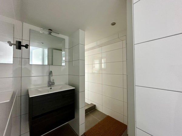 De badkamer bevindt zich eveneens op de begane grond en is uitgerust met een inloopdouche en een modern wastafelmeubel.