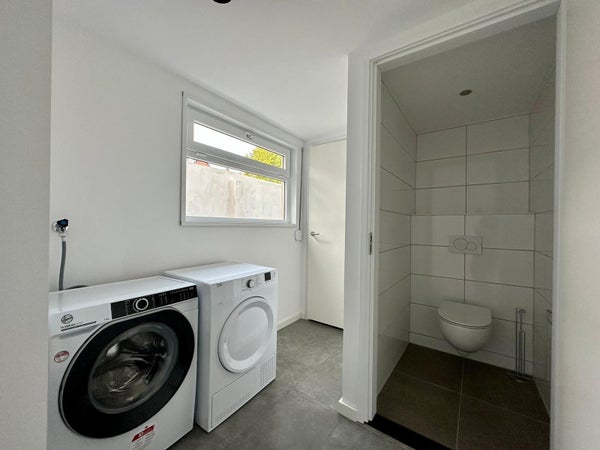 Aan de achterzijde bevindt zich een schuifpui die toegang geeft tot de diepe achtertuin. Achter de keuken is de bijkeuken gesitueerd, voorzien van een wasmachine en droger, evenals een separaat toilet.