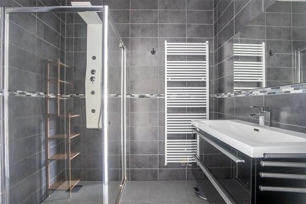 • Overloop, drie slaapkamers + badkamer (met douche en wastafel met lades etc.)