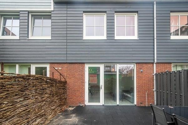 • De tuin heeft houten schuttingen voor privacy, met toegang tot een kleine kinderspeelplaats en parkeerplaatsen achter.