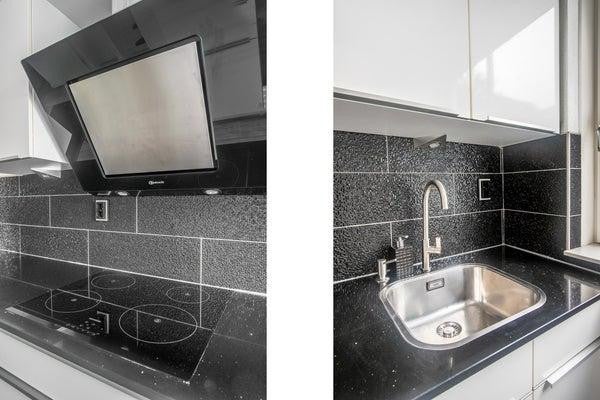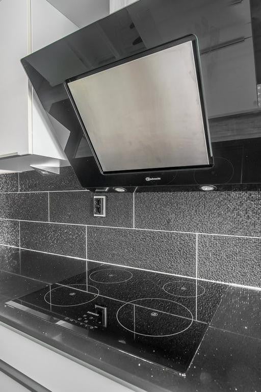 • Complete keuken uitgerust met granieten aanrechtblad inclusief koelkast, vaatwasser, inductiekookplaat met afzuigkap, magnetron en oven.