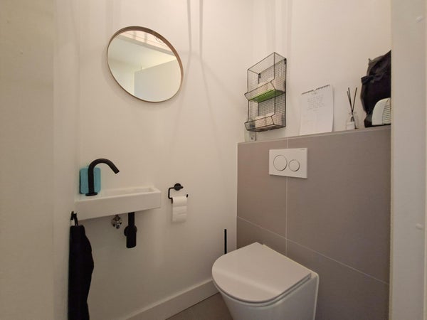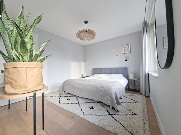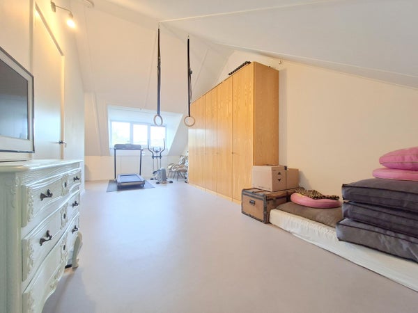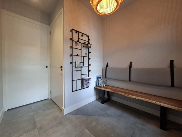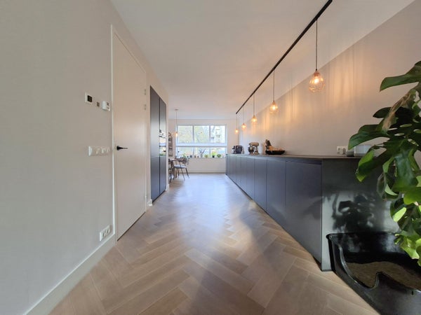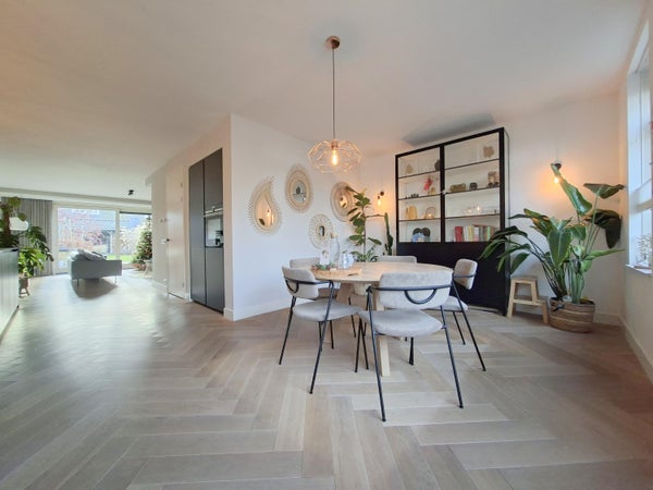 Aan de voorzijde bevindt zich het eetgedeelte, terwijl aan de achterzijde een royale zithoek is gesitueerd met een schuifpui naar de tuin. Dankzij de grote raampartijen is de woning uitzonderlijk licht. De afwerking is modern, strak en verzorgd, met een fraaie vloer die het geheel compleet maakt.