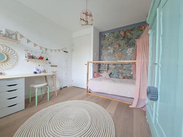 Op de eerste verdieping bevinden zich een apart toilet, een complete badkamer met ligbad, douche en wastafelmeubel, een comfortabele ouderslaapkamer met walk-in closet, een tweede slaapkamer, ingericht als kinderkamer en nog een derde kamer welke als werkkamer gebruikt kan worden.