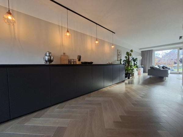 De open keuken is opvallend lang en volledig langs de wand geplaatst, wat zorgt voor veel werk- en kastruimte — perfect voor kookliefhebbers.