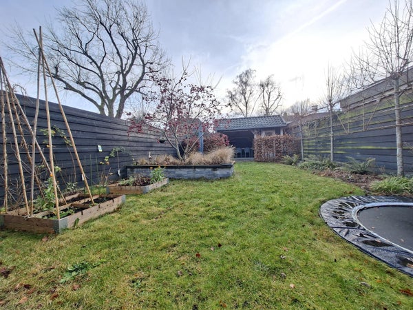 De woning beschikt over een ruime voortuin met parkeergelegenheid op eigen terrein en een grote achtertuin met overkapping en vrijstaand schuurtje. Een heerlijke plek om te ontspannen, te spelen of lange avonden buiten door te brengen.