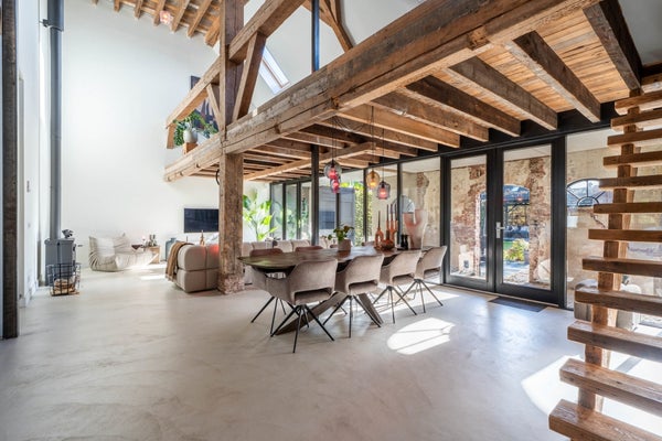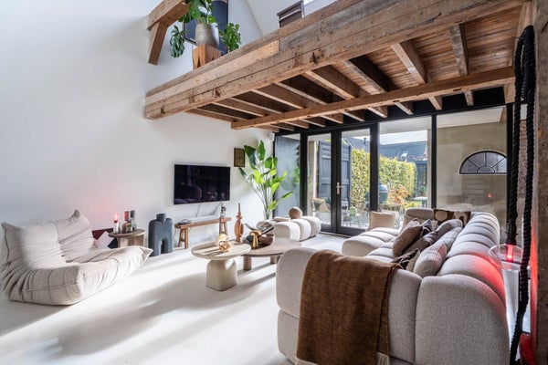 Schitterende living met authentieke elementen en houtkachel, trapopgang naar verdieping en trapopgang naar de multIfunctionele vide.