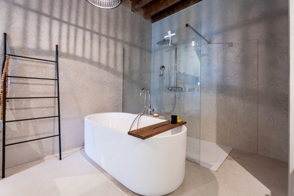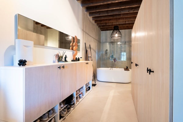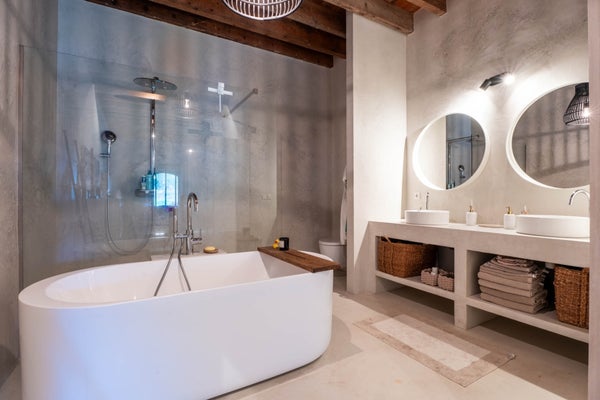 Luxe badkamer voorzien van een ligbad, dubbele waskom, inloopdouche en toilet.