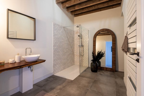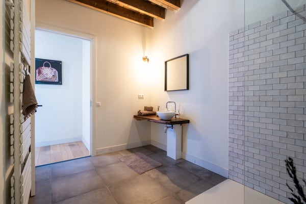 De badkamer op de eerste verdieping is voorzien van een inloopdouche, waskom en toilet.