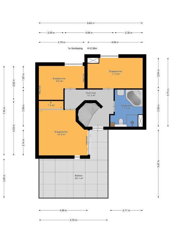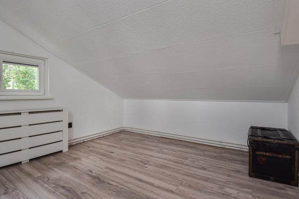 Op de eerste verdieping bevinden zich drie slaapkamers en een ruime badkamer met ligbad, aparte douche, wastafel en toilet. Via de overloop is het grote balkon (ca. 22 m²) bereikbaar. De tweede verdieping beschikt over een vierde slaapkamer met bergruimte en extra zolderkamer.