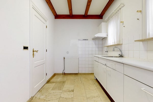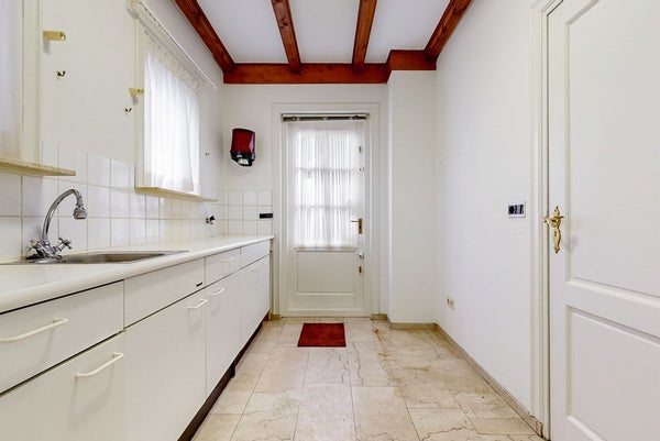 Op de begane grond bevinden zich tevens de keuken en de praktische bijkeuken, ideaal voor extra bergruimte en het dagelijks gebruik. Daarnaast is er een extra kamer die zich uitstekend leent als slaapkamer, hobbyruimte of kantoor aan huis. Deze ruimte biedt flexibiliteit en maakt gelijkvloers wonen mogelijk.