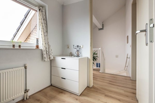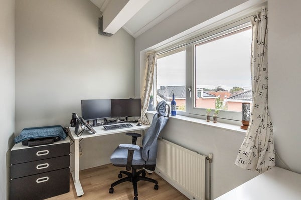 De zolder bestaat uit een voorzolder, een ruime derde slaapkamer en een vierde kamer die momenteel in gebruik is als werk- of studeerkamer. Dankzij de dakkapel is de kamer prettig licht en van een royaal formaat. Deze slaapkamer beschikt over een vliering, ideaal voor extra opbergruimte. Op de voorzolder bevinden zich tevens de aansluitingen voor de wasmachine en de droger en de cv-installatie.