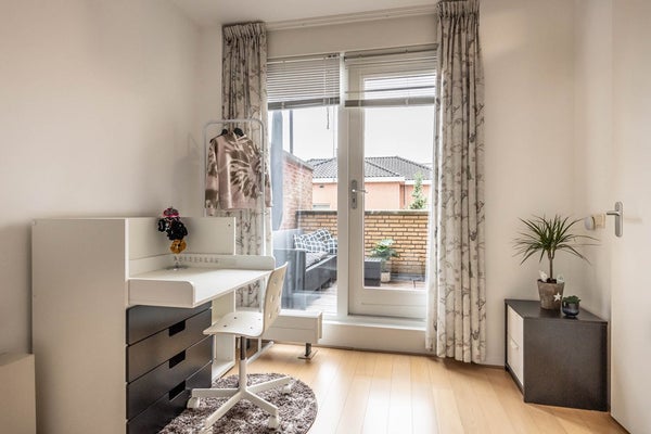 Op de eerste verdieping bevinden zich twee slaapkamers en de badkamer. De slaapkamer aan de achterzijde is ingericht als master bedroom met praktische inbouwkast. De slaapkamer aan de voorzijde heeft toegang tot het balkon die is gelegen op het zuidoosten. De gehele verdieping is voorzien van een lichte parketvloer.