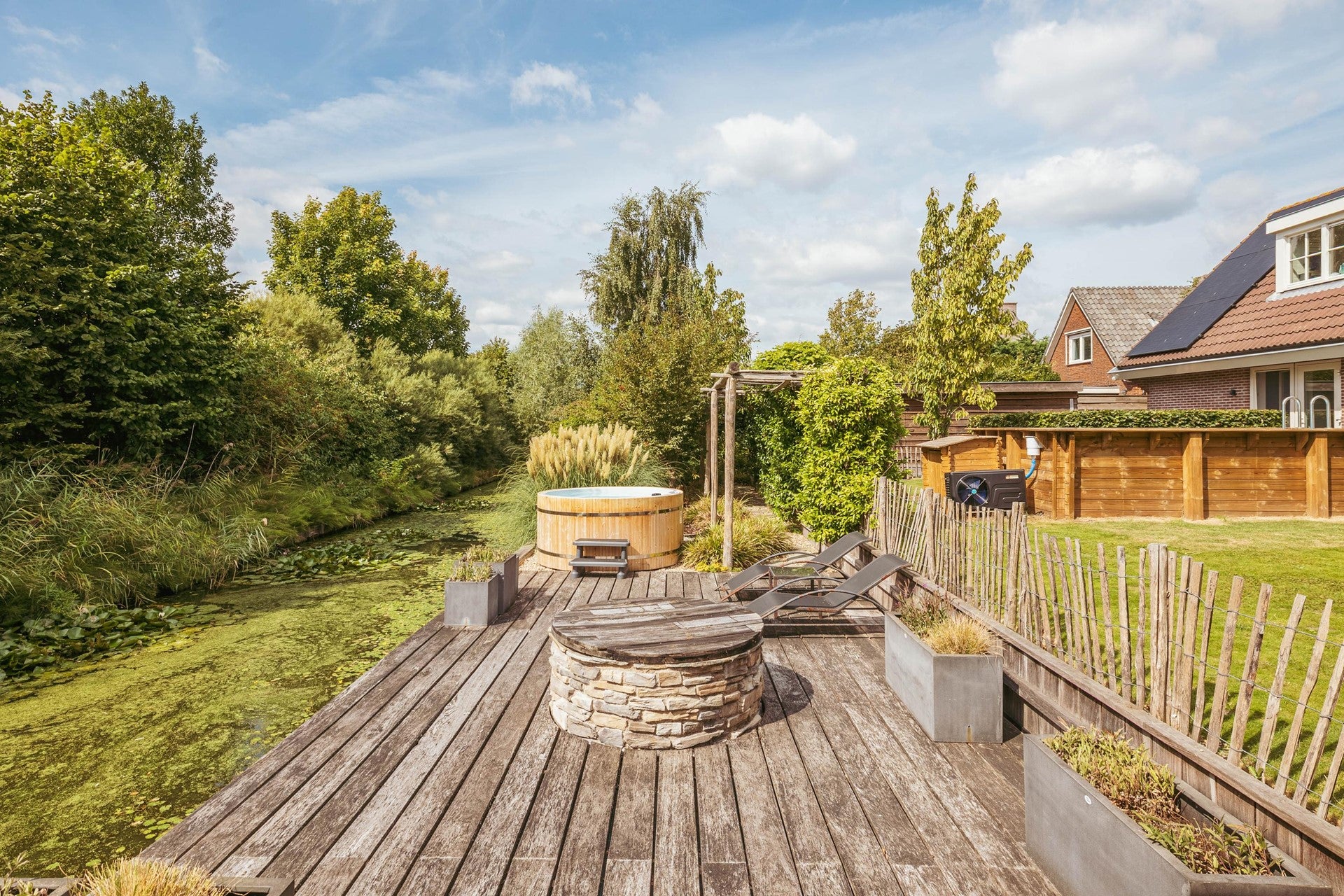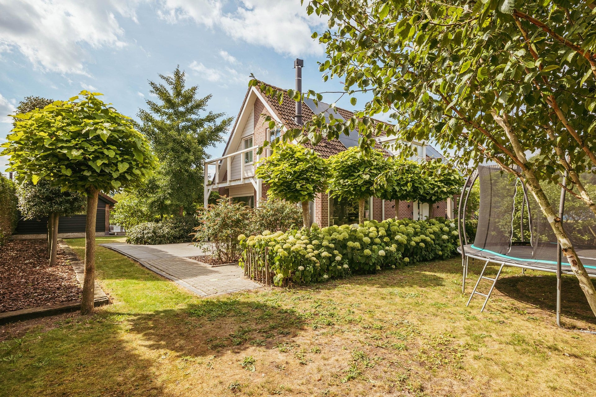 Dit vrijstaande landhuis aan de Machineweg 302-A in Aalsmeer biedt een unieke levensstijl met een gastgebouw, verwarmd zwembad en jacuzzi op een perceel van bijna 1.295 m². Het huis, gebouwd in 1995 en recent gerenoveerd, beschikt over een energielabel A en 33 zonnepanelen. De ruime entree leidt naar een lichte woonkamer, een royale leefkeuken met openslaande deuren naar de tuin, en een multifunctionele aanbouw die als garage of kantoor gebruikt kan worden. Op de eerste verdieping bevinden zich de hoofdslaapkamer met ensuite badkamer en drie extra slaapkamers. Achterin de tuin is het luxe bijgebouw van 36 m², perfect voor gasten of als atelier. De prachtig aangelegde tuin biedt diverse terrassen en uitzicht op het sierwater, ideaal voor ontspanning.