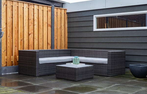 Met de fiets in de ene hand en de containers in de andere komen we via de achterom binnen. Meteen een dak boven ons hoofd. We zetten de fiets in de stenen berging. Hier is niet alleen ruimte voor de fietsen. Ook het tuinmeubilair heeft een plekje om te overwinteren en er is een werkbank voor de mensen met twee rechterhanden. De ruimte is strak afgewerkt met inbouwspots onder de overkapping. De achtertuin is royaal en praktisch tegelijk. Er is genoeg plek voor een loungeset, een eettafel of andere tuinmeubels, zodat je hier de heerlijk kunt ontspannen.