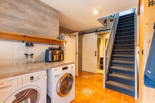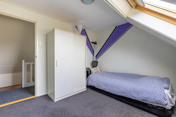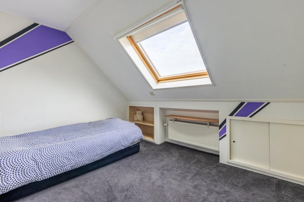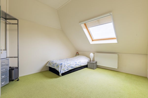 Naast de ruime masterkamer beneden bekijken we op de verdieping nog twee nette slaapkamers die voorzien zijn van Velux dakramen. De Remeha combiketel (2010) treffen we in de extra bergruimte, net als de Growatt omvormer voor de 8 zonnepanelen (2023). Via een luik op de overloop is nog de bergzolder te bereiken en hebben we zicht op de geïsoleerde kap. Handige ruimte voor de nodige opslag.