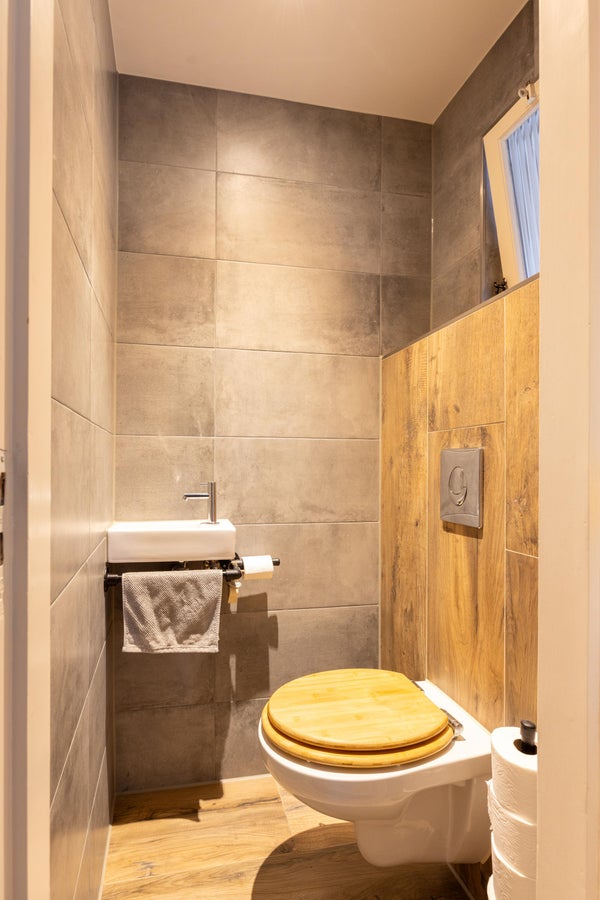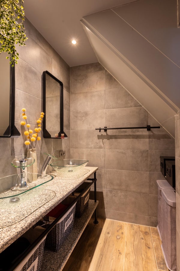 Parkeren van meerdere auto’s, je caravan of camper gaat hier gemakkelijk op eigen terrein en dat is toch wel een luxe. En binnenlopen? Dat gaat in de Achterhoek zoals gewoonlijk via de achterom waar de fraaie overkapping (met glazen schuifwanden) een gezellige overgang is tussen buiten en binnen. De achterdeur staat dan doorgaans uitnodigend open en in de ruime bijkeuken staat handig de wasmachine en droger opgesteld met een extra spoelbak en koel-vriescombi om het hoekje. De trapopgang laten we voor nu rechts liggen en lopen door richting de badkamer die niet zo lang geleden compleet onderhanden is genomen. Een breed wastafelmeubel met dubbele kraan, een royale inloopdouche en vloerverwarming maakt het een fijne plek om de dag rustig te beginnen of in stijl af te sluiten. Via de hal ernaast is de heerlijk ruime slaapkamer te vinden die in combinatie met de naastgelegen badkamer nu al zorgt voor comfortabel wonen, maar ook zorgeloos voor de toekomst. Aan de andere zijde van de hal noteren we het modern betegelde toilet en bekijken we de vernieuwde meterkast met voldoende groepen.