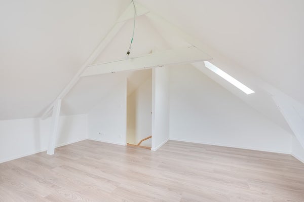 De eerste verdieping is ingericht als een ruime slaapkamer met dakramen. Dankzij de slimme renovatie is dit een comfortabele en lichte ruimte, waar voldoende plek is voor een tweepersoonsbed en kastruimte.