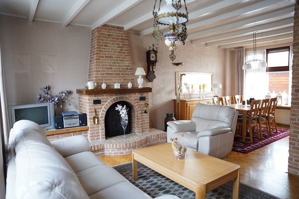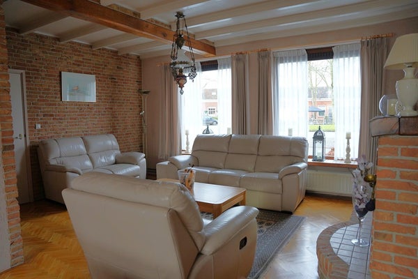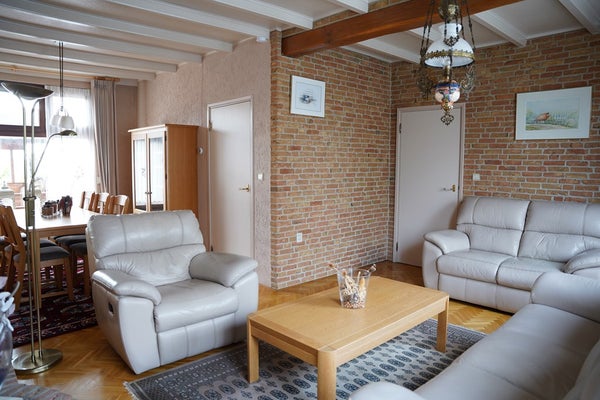De L-vormige woonkamer heeft een prachtige parketvloer en in de zithoek is een houtkachel met ventilator voor extra warmte en sfeer.