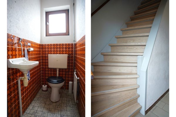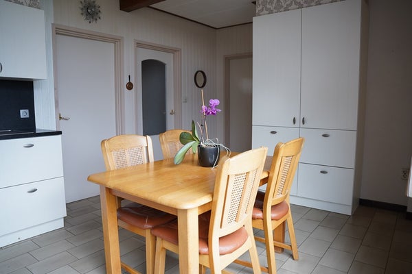 De woning heeft een bijkeuken met wasmachineaansluiting, voldoende bergruimte en een retro toilet.