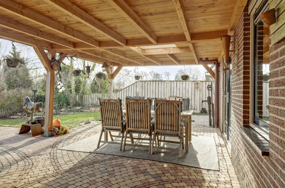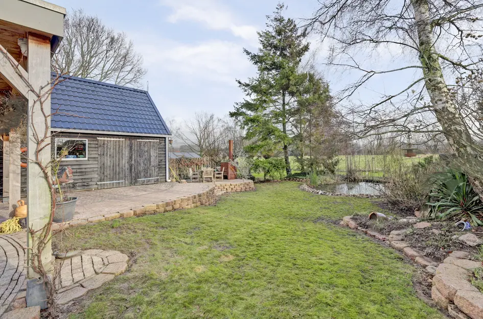 Vanuit de woonkamer heb je schitterend zicht op je eigen stuk grond van 2.720m2 aan de voorzijde, de openslaande deuren aan de achterzijde geven toegang tot de grote tuin met overkapping.