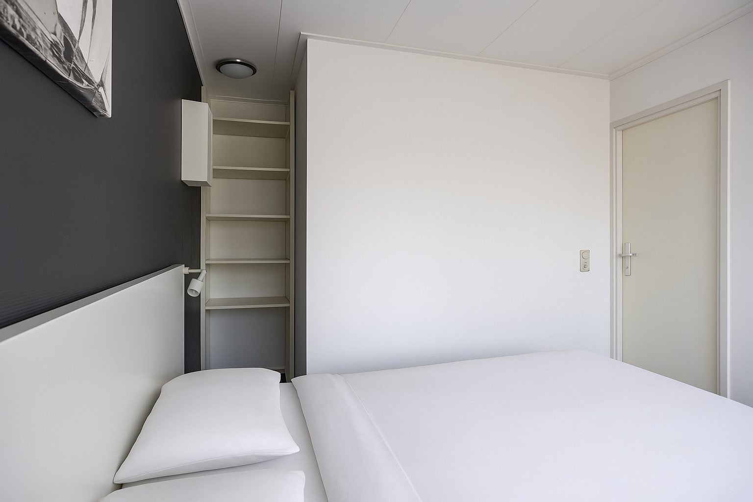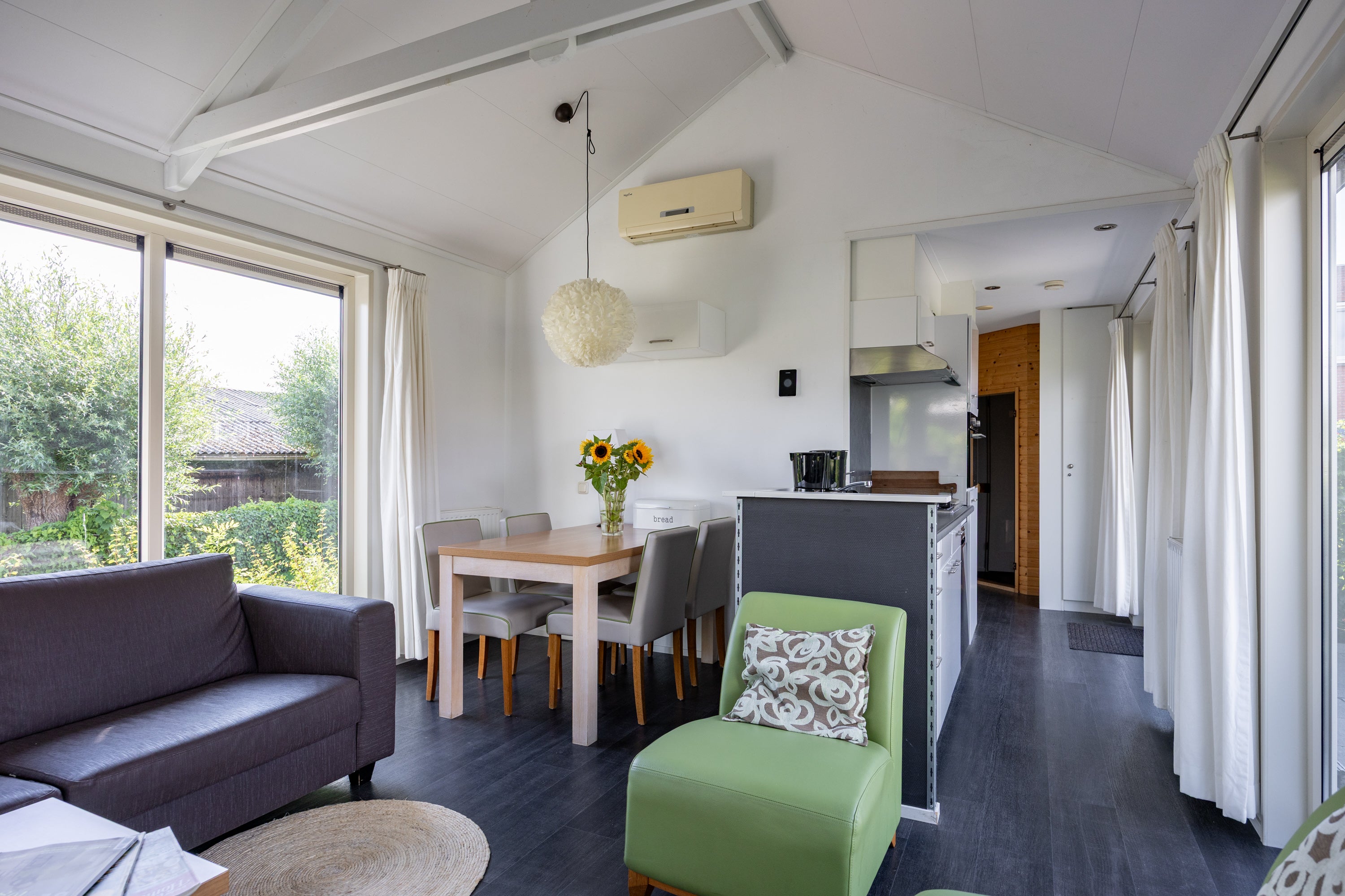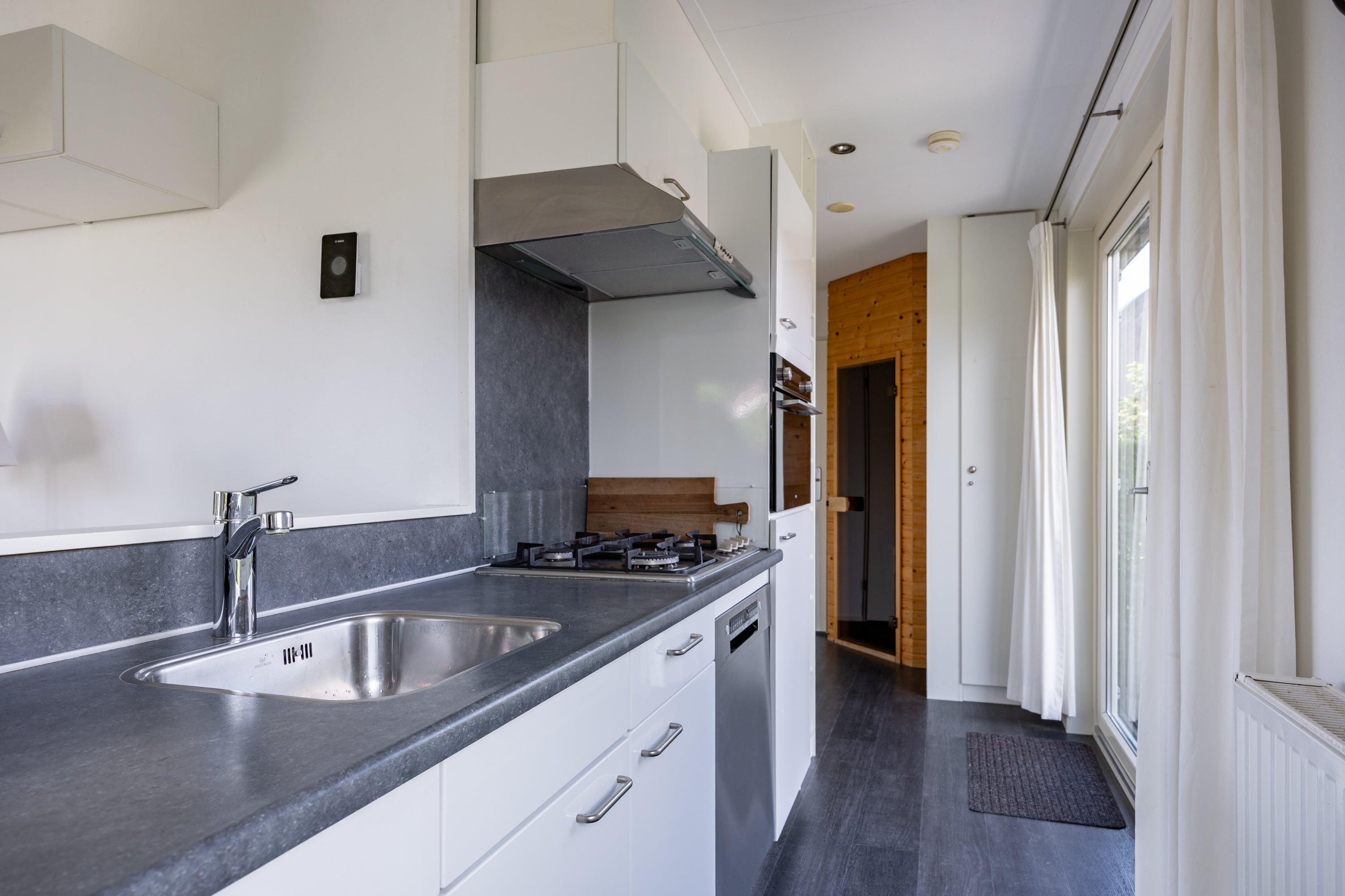 De indeling bestaat uit een open woonkamer met zithoek, een keuken met inbouwapparatuur zoals een gasfornuis en vaatwasser, een hoofdslaapkamer met tweepersoonsbed, en een tweede slaapkamer met een stapelbed. De badkamer is voorzien van een douchecabine en wastafel.