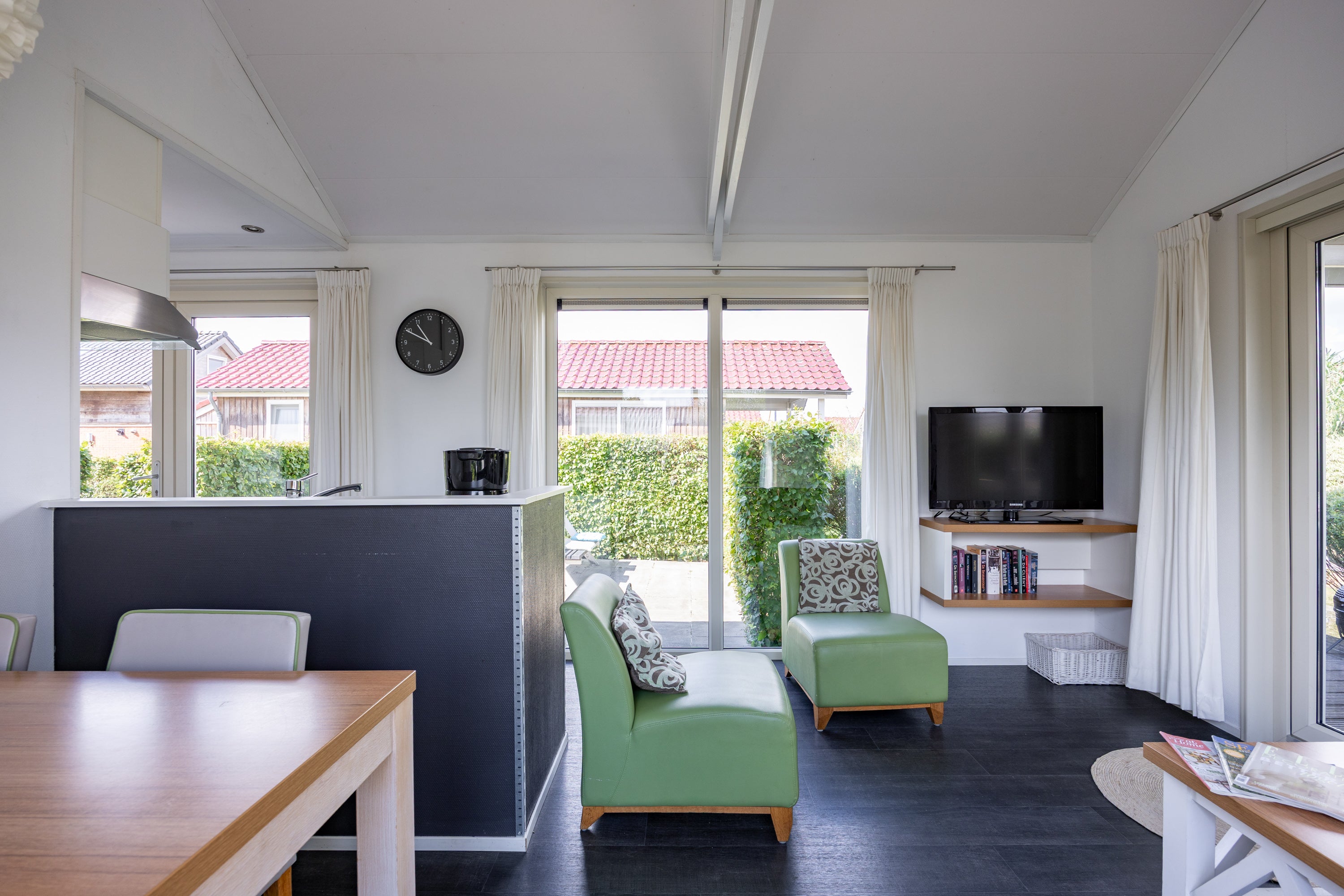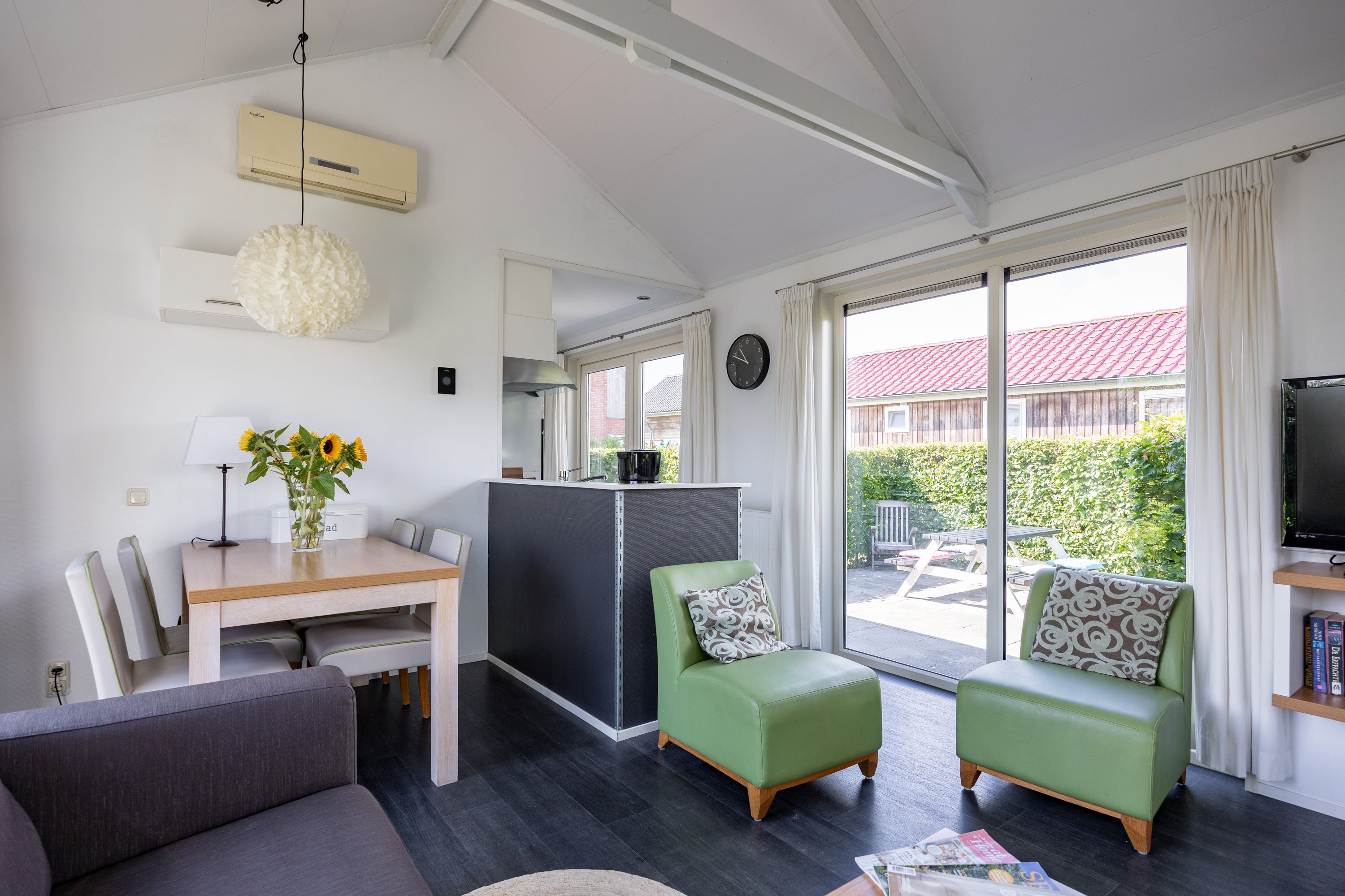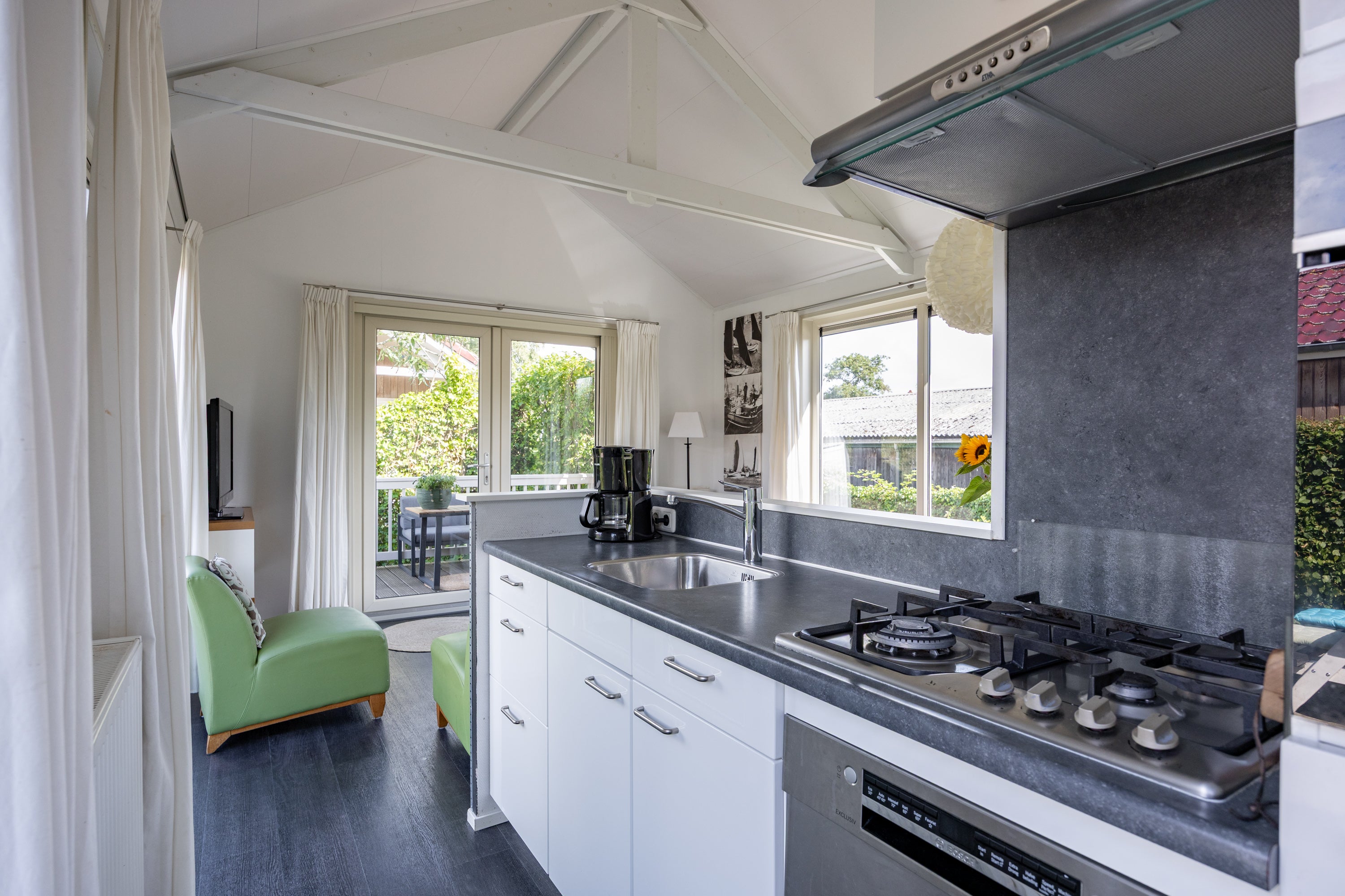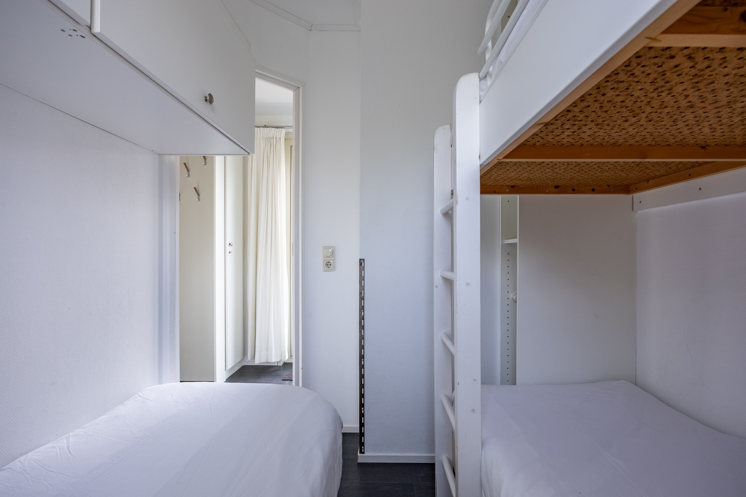 De indeling bestaat uit een open woonkamer met zithoek, een keuken met inbouwapparatuur zoals een gasfornuis en vaatwasser, een hoofdslaapkamer met tweepersoonsbed, en een tweede slaapkamer met een stapelbed. De badkamer is voorzien van een douchecabine en wastafel.