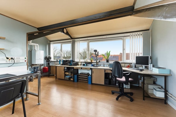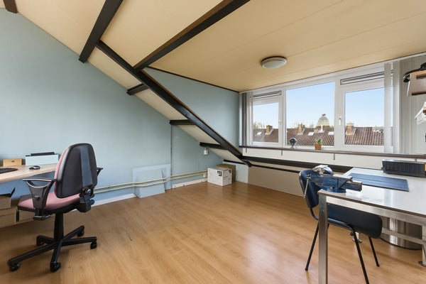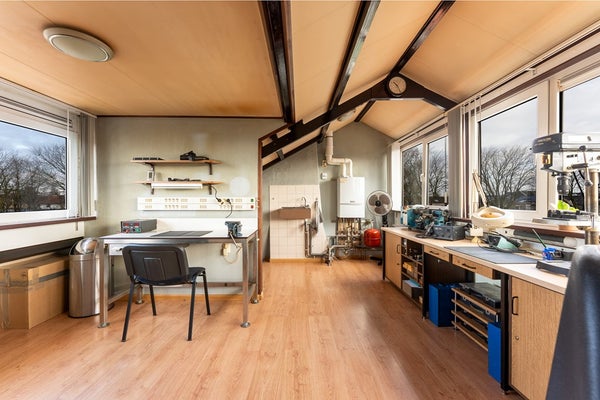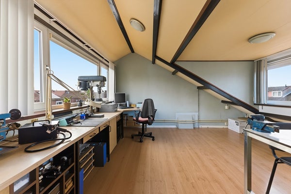 Slaapkamer 4: Via de vaste trap bereik je de zolder, die door een nokverhoging en een dakkapel aan de voorzijde bijzonder ruim is. Door de vele ramen valt er volop daglicht binnen, waardoor de ruimte licht en open aanvoelt. De zolder biedt volop mogelijkheden als hobbyruimte of extra slaapkamer. Er is ook een wasbak aanwezig, wat het gebruik van de ruimte extra praktisch maakt. De afwerking is netjes en verzorgd, met een laminaatvloer, structuurwanden en een gips plafond.