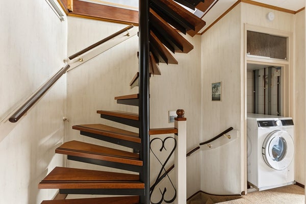 Overloop: De overloop heeft twee vaste kasten en geeft toegang tot drie slaapkamers, de badkamer en de trapopgang naar de tweede verdieping. In een vaste kast kun je bijvoorbeeld een wasmachine plaatsen. De overloop is afgewerkt met vloerbedekking, behangwanden en een gips plafond.