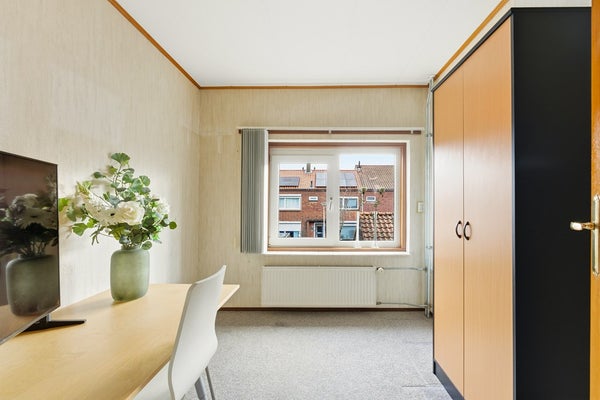 Slaapkamer 1: Slaapkamer één ligt aan de achterzijde van de woning en is ruim van formaat. De kamer biedt voldoende ruimte voor een bed, bureau en kledingkast. Dankzij de hor kun je hier zorgeloos ventileren. Alle slaapkamers op deze verdieping zijn afgewerkt met vloerbedekking, behangwanden en een gipsplafond.