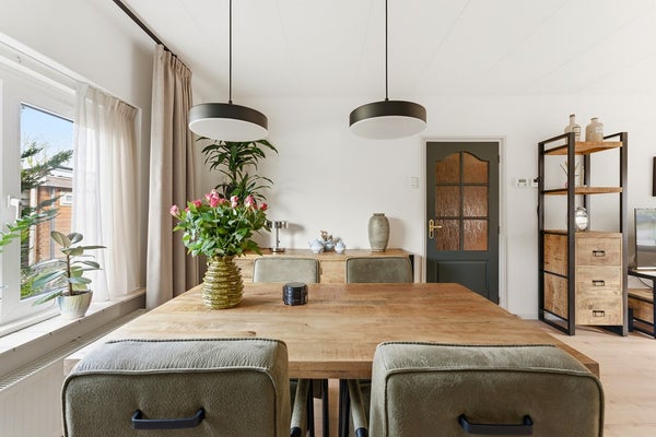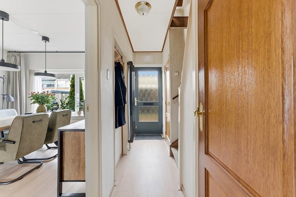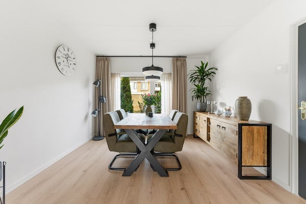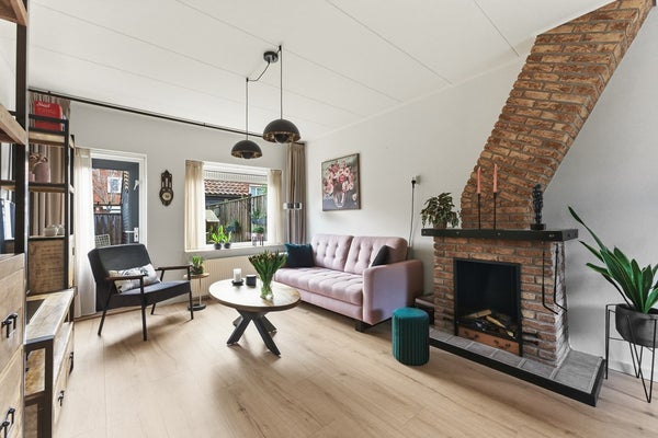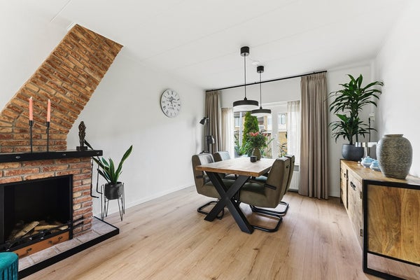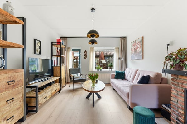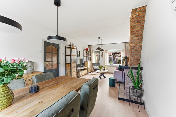 Woonkamer: De doorzon woonkamer is licht en ruim, met een gezellige sfeer die direct uitnodigt om te ontspannen. Er is een sfeerhaard aanwezig. Voorzieningen zoals rolluiken aan zowel de voor- als achterzijde zorgen voor comfort en privacy. De indeling biedt voldoende plek voor een zithoek aan de voorzijde en een eethoek aan de achterzijde. De woonkamer is afgewerkt met een laminaatvloer, gestuukte wanden en een gips plafond.