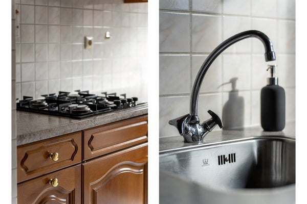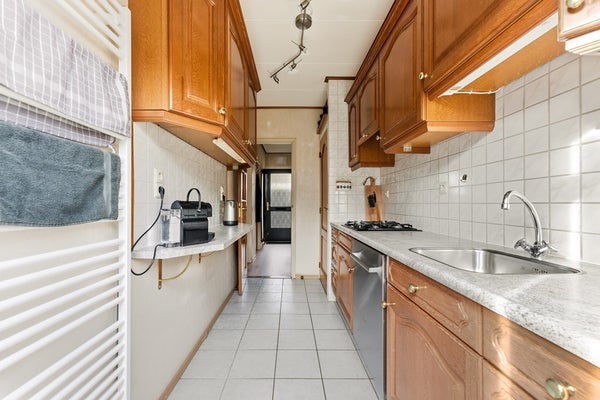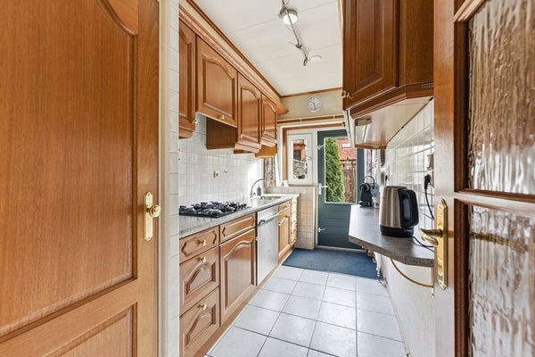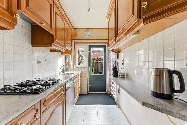 Keuken: De keuken is gesloten en ligt aan de achterzijde van de woning, met een deur naar de achtertuin. Hoewel gedateerd, is de keuken van uitstekende kwaliteit en volledig functioneel. De keuken is uitgerust met een 4-pits gasstel, afzuigkap, vriezer en een close-in-boiler. Door de indeling is er voldoende werkruimte en bergruimte aanwezig. Het contact met de achtertuin zorgt voor lichtinval en een prettige sfeer. Voor wie de voorkeur geeft aan een open woongevoel, biedt de indeling de mogelijkheid om de keuken open te maken naar de woonkamer.