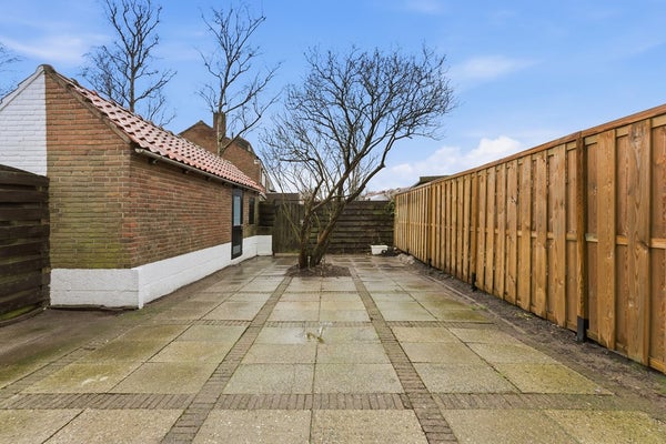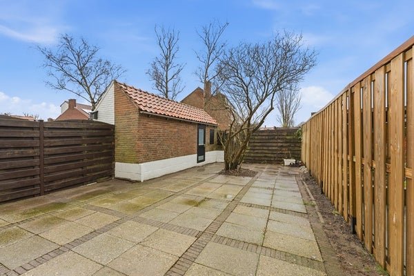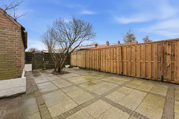Achtertuin: De achtertuin ligt op het zuidwesten en heeft een afmeting van circa 11 x 6 meter. Door de diepte van de tuin is er ruimte voor verschillende indelingen met zit- of eetplekken. De tuin is grotendeels voorzien van sierbestrating en beschikt over een zonnescherm en wateraansluiting. De erfafscheiding bestaat uit een houten schutting.