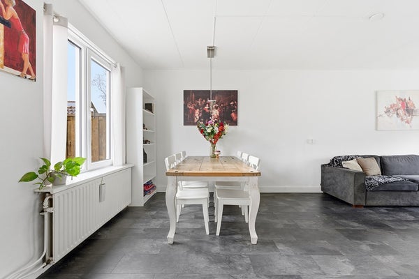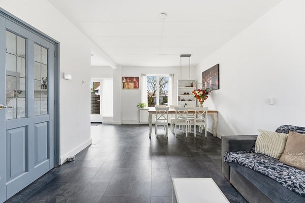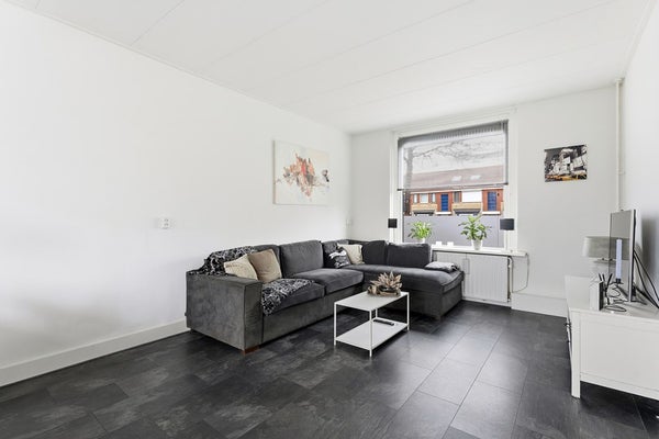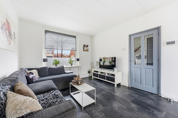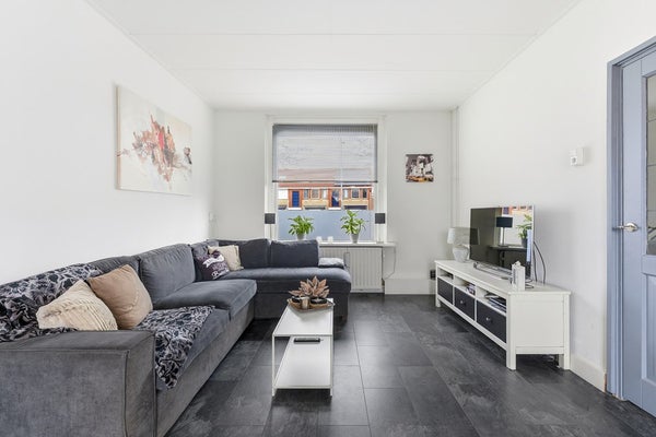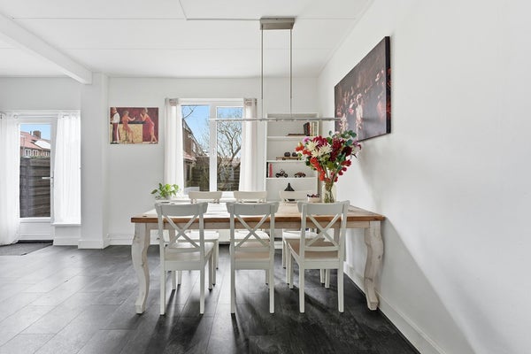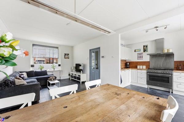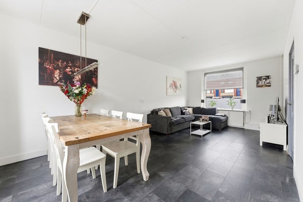 Woonkamer: De woonkamer is ingedeeld met een zithoek aan de voorzijde van de woning en een eethoek aan de achterzijde. Aan de voorzijde zijn houten kozijnen aanwezig met dubbelglas en aan de achterzijde kunststof kozijnen met HR triple beglazing. Door de plaatsing van het eetgedeelte direct bij de keuken ontstaat een praktische woonindeling. De ruimte is afgewerkt met een laminaatvloer, wit gesausde wanden en een gips plafond. De diepe achtertuin biedt bovendien de mogelijkheid om een aanbouw te realiseren, waardoor de woonruimte verder kan worden uitgebreid.
