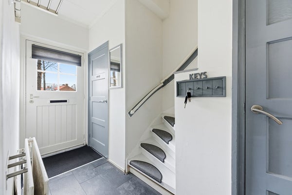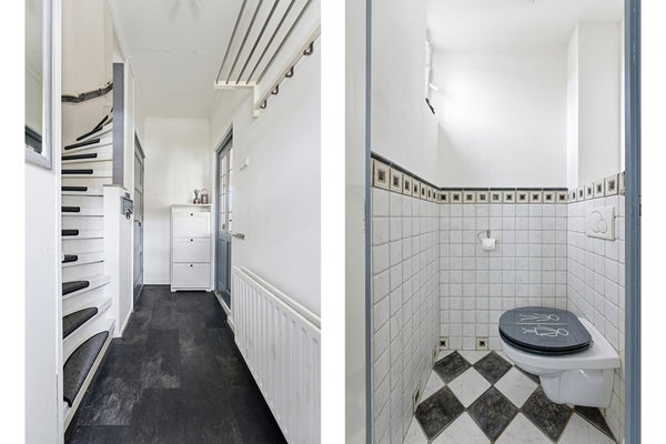 Entree: Via de voortuin bereik je de entree van de woning. In de hal is ruimte voor een kapstok en hier geven paneeldeuren toegang tot het toilet en de trapkast. Vanuit de hal loop je door naar de woonkamer of neem je de trap naar de eerste verdieping. De trapkast biedt praktische bergruimte en hier bevindt zich ook de meterkast. De hal is afgewerkt met een laminaatvloer, gestuukte wanden en een gips plafond.