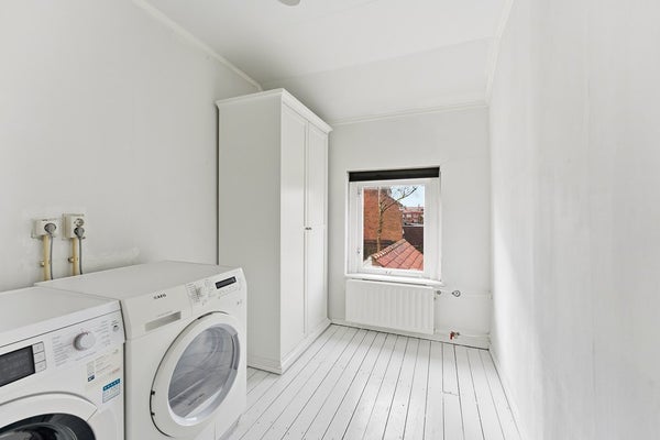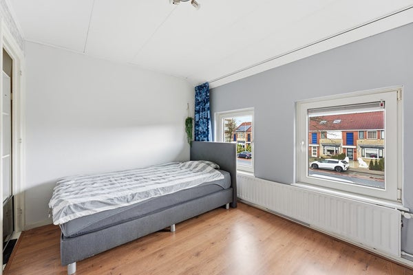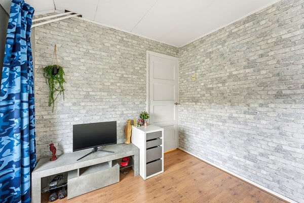 Slaapkamer 1: Slaapkamer één ligt aan de achterzijde van de woning en beschikt over een inbouwkast. In deze kamer bevinden zich de aansluitingen voor de wasmachine en droger, waardoor de ruimte meerdere functies kan vervullen. Daarnaast is er een opening naar een zolderruimte aanwezig. De kamer is afgewerkt met een houten vloer, behangwanden en een gips plafond.