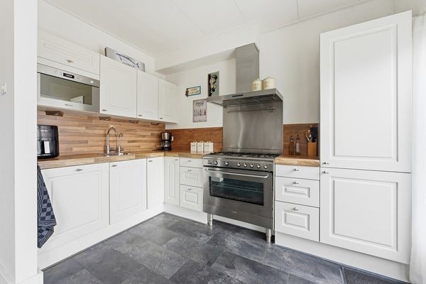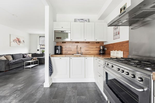 Keuken: De open keuken bevindt zich aan de achterzijde en is opgesteld in een hoekopstelling. Vanuit het eetgedeelte loop je direct de keuken in, wat zorgt voor een prettige verbinding tussen koken en tafelen. De keuken is voorzien van een oven, koel-vriescombinatie, vaatwasser, 5 pits gaskookplaat, afzuigkap en een magnetron. Diverse apparatuur functioneert niet en is aan vervanging toe. De ruimte is afgewerkt met een laminaatvloer, gestuukte wanden en een gips plafond.