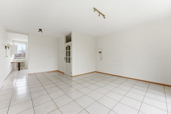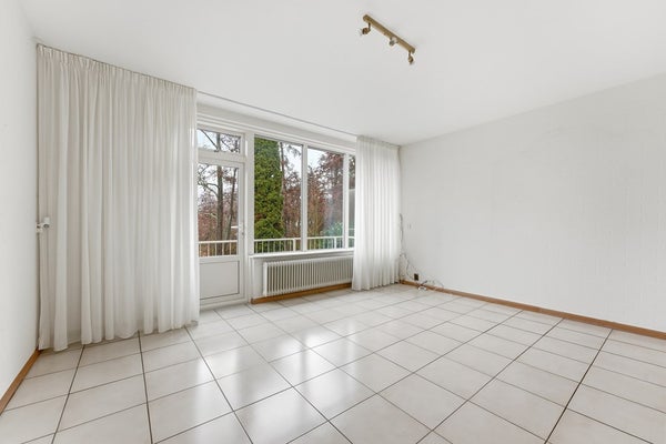 Woonkamer: De woonkamer is ruim van formaat en valt op door de grote raampartijen, die zorgen voor veel daglicht. Met gemak creëer je hier een royale zithoek met uitzicht op het groen en een eethoek plaats je richting de keuken. De ruimte is afgewerkt met een plavuizenvloer, granolwanden en een gestuukt plafond. Daarnaast biedt de woonkamer volop mogelijkheden om deze geheel naar eigen smaak te moderniseren. Via de deur stap je zo het balkon aan de achterzijde op.